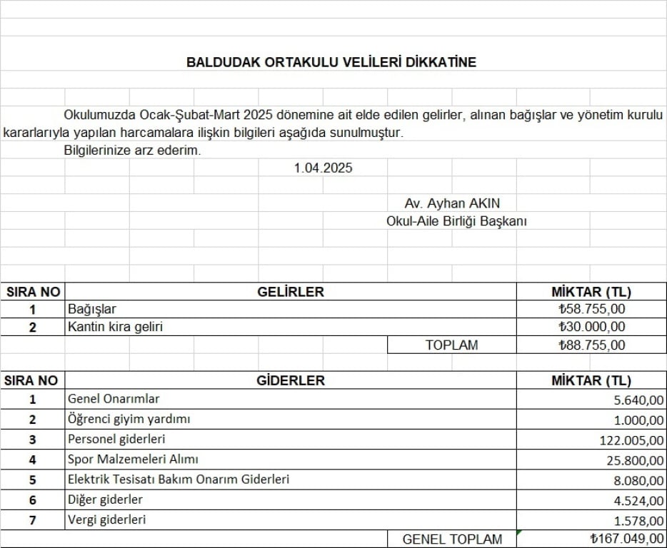 Baldudak Ortaokulu Gelir Gider Bilgileri